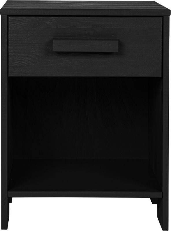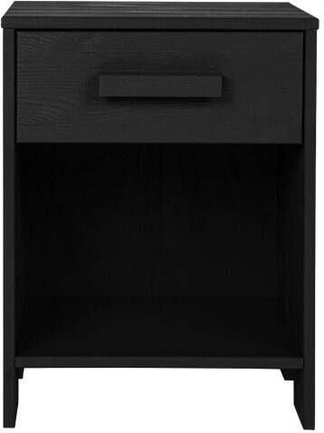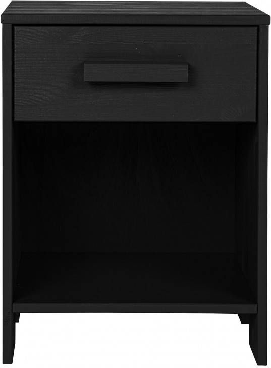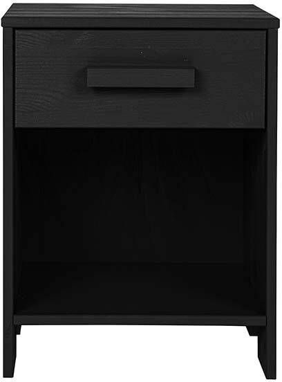 Het Woood nachtkastje Dennis past perfect bij de andere grenen zwarte meubels uit de Woood Dennis collectie. Het nachtkastje is voorzien van een lade en een open vak. Het meubel is voorzien van geborsteld hout dit zorgt voor een robuuste look.